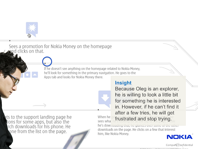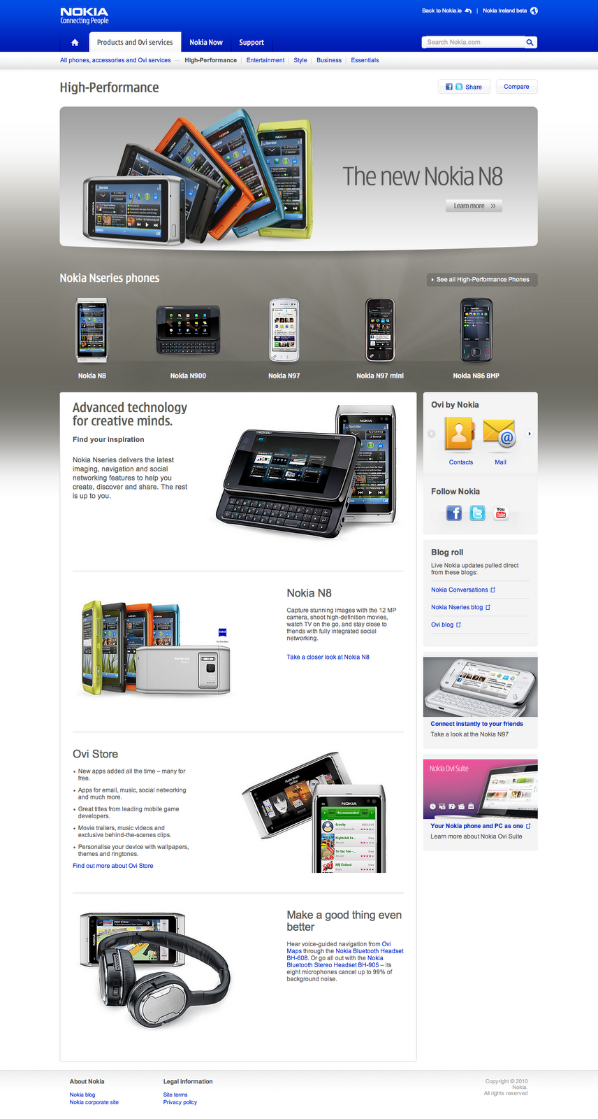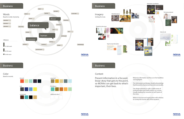 The final part of the work we did for Nokia consisted of content guidance. Again, we wanted to show the consumer what they wanted first - a phone. Then, as the user scrolls down the page, services and accessories are discovered in the context of the phone (e.g., images of the service on the screens or of someone using the service in the real world). Furthermore, we were able to leverage the personas to create completely different looks for each solution and organize the content in ways most relevant to the persona.