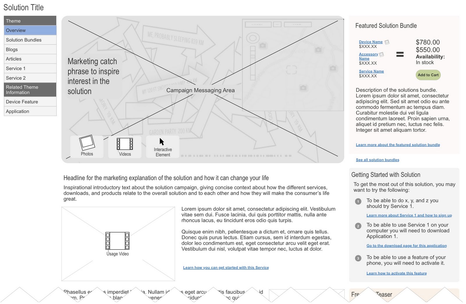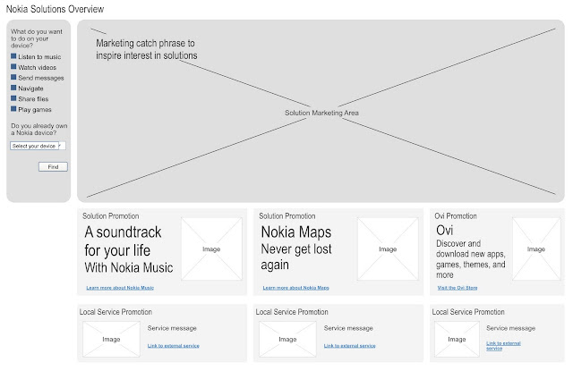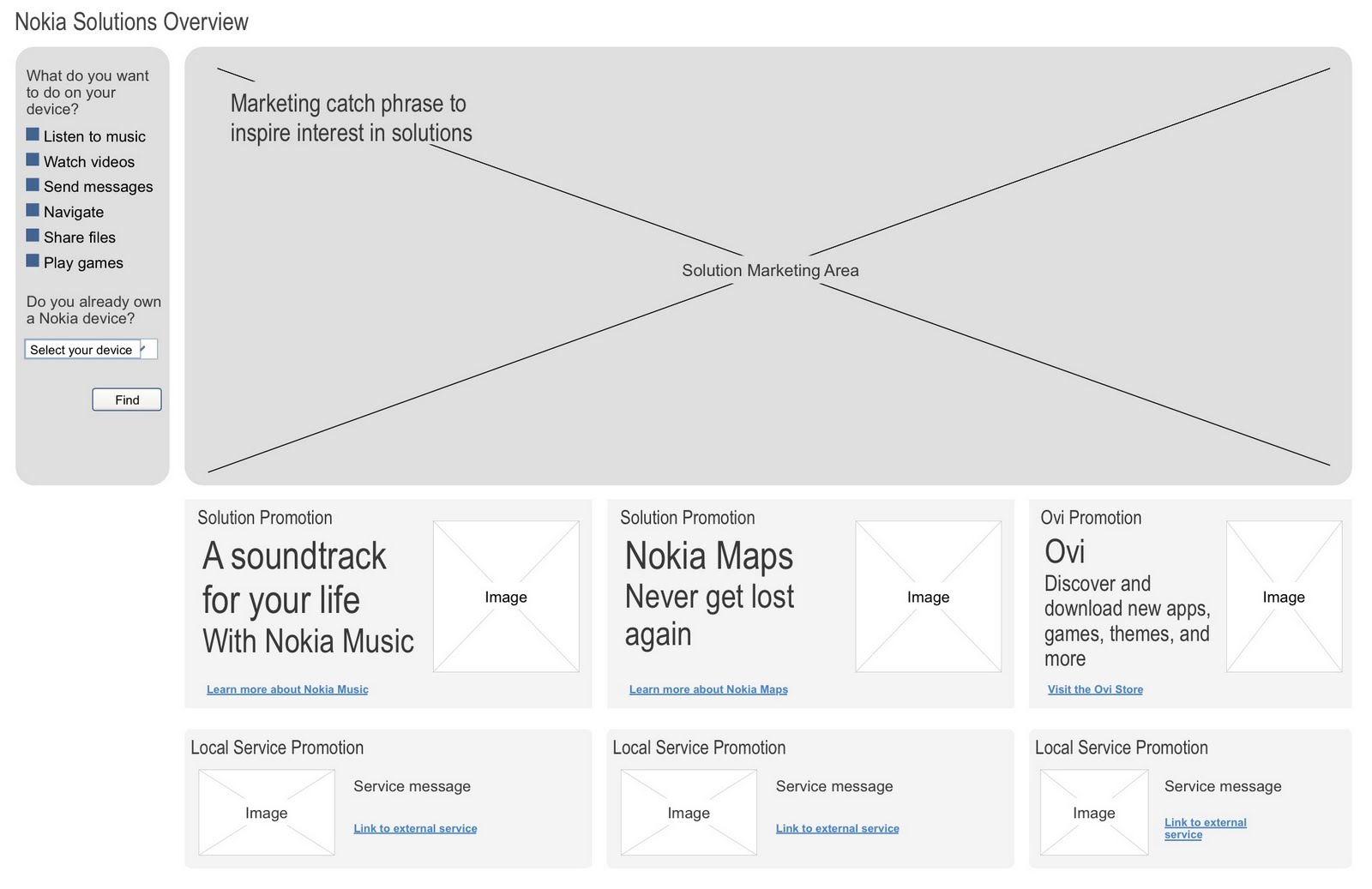 We all understood that consumers didn't go to Nokia.com for "solutions" - they go to find a phone. Through wireframes, we organized the content to provide contextual explanations. Knowing that users look at phones first, we wanted to allow users to discover the phone they wanted, then dive into detailed information about services and features when they were further along the purchase funnel.