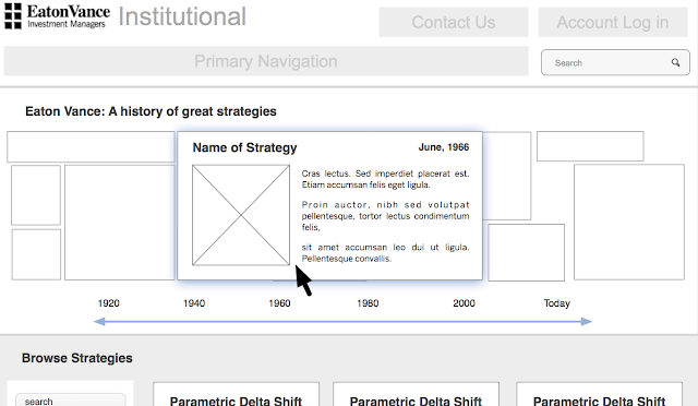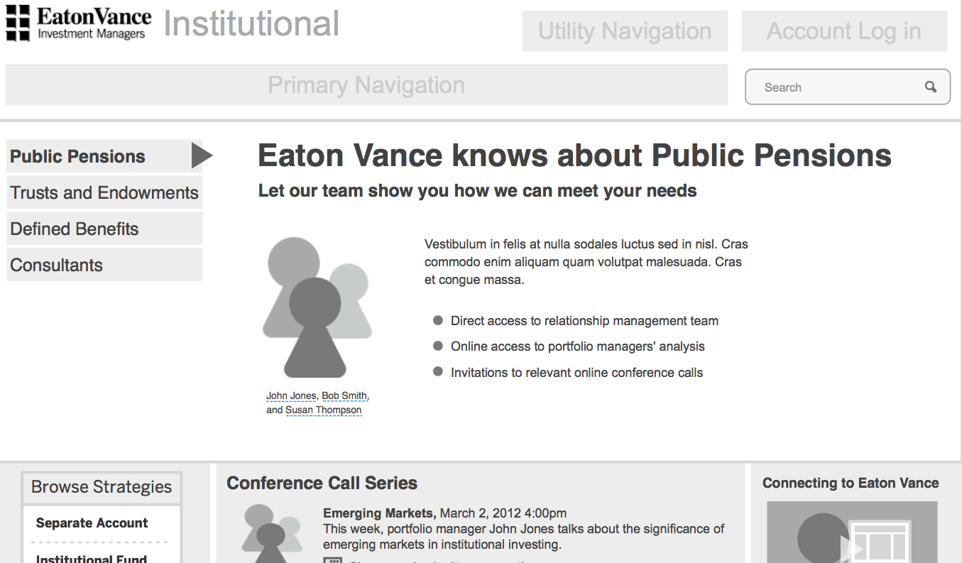 To continue to grow their business, Eaton Vance needed a website that would give them a legitimate presence in the institutional space. At Hot Studio, I worked on the team that had created the look and feel for the retail site, but what works for retail advisors, doesn't quite work for those who deal with institutions. Therefore, Eaton Vance challenged us to create a site that would appeal to their institutional audience while remaining in alignment with their established brand.