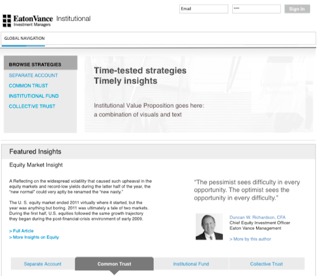 We produced a final direction to showcase Eaton Vance’s thought leadership and thought leaders. The idea being that institutional investors would have access to thought leadership not available on the retail side.