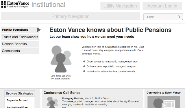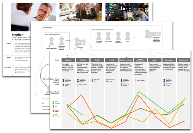 As part of a larger strategic process, I interviewed institutional investors to understand how they do business and where the Eaton Vance website fits into their larger process. I created personas and user journey maps to show the day-to-day activities of people involved in institutional investing. We were able to use these insights to understand key points of differentiation between institutional investors and retail investors.