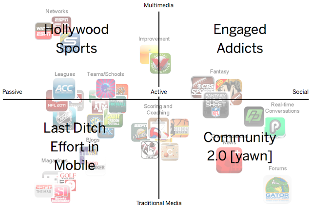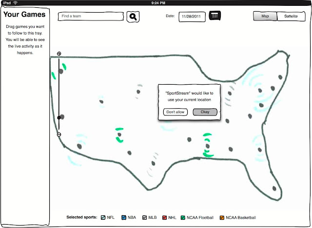 Probably one of the biggest insights into our audience's behavior is their desire to be a part of the action. They may be watching the game at home, but they're participating, too: from yelling at the TV to texting with friends. And they want to be informed when they do reach out to others. Therefore, our app needed to allow them to participate in the game while keeping them abreast of what's going on in the rest of the sports world. Coming out of this, our most important design principle was "Make it easy for me to follow and be a part of the action."