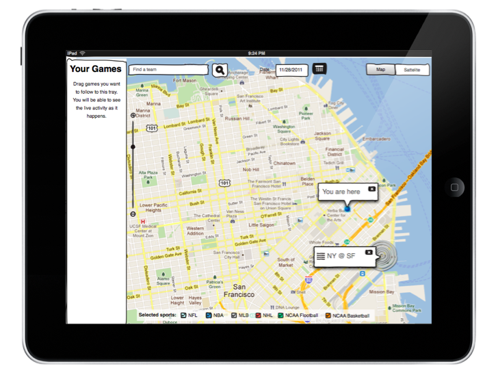 When designing the interface, our primary goal was to replicate the energy and excitement of the game and provide easy, one-tap ways for people to contribute to the action. We designed an interactive map that showed the level of activity hot spots based on the Evri stream of aggregated content. To really encourage participation, we wanted to provide immediate feedback that showed how their actions contribute to the overall energy of the game. We designed mechanisms for quick contributions that would post to Twitter or Facebook making the "noise" for their team louder. For those who didn't have time for typing, we created the notion of one-tap cheering that would immediately change the level of the "noise" meter on their device.