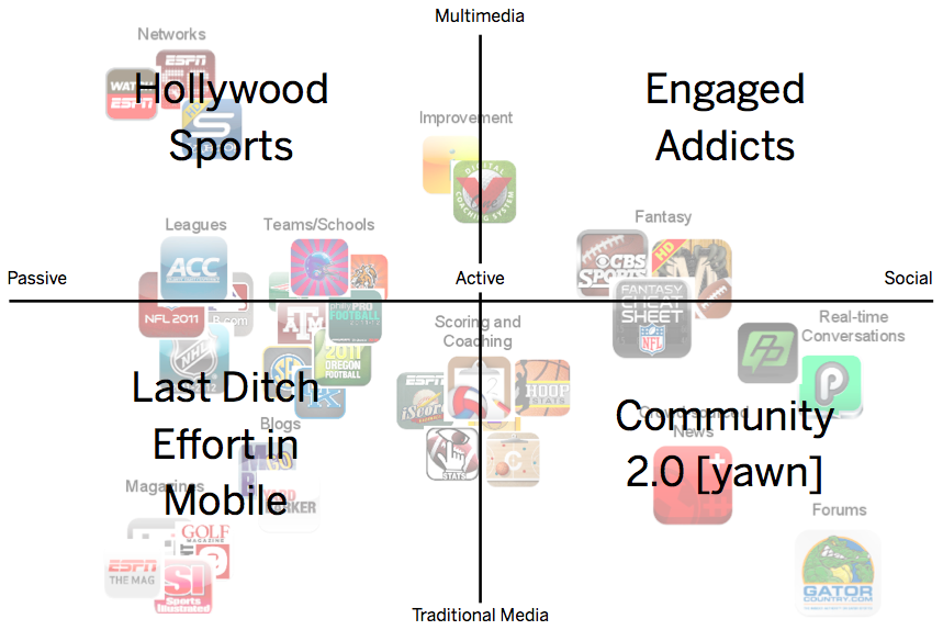 Through a comprehensive analysis of the completely saturated competitive space, we were able to locate an opportunity for Evri's SportStream: engaged addicts. Passive information (e.g., stats, scores, and video) are certainly important in a second screen experience. However, the real opportunity was in more actively engaging in the game while watching it from the comfort of your home.